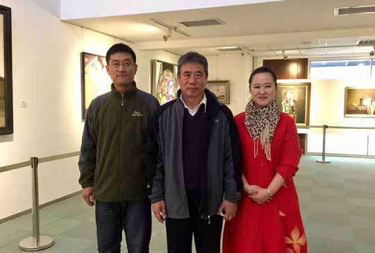 刘孟嘉先生(右一)与馆长探讨忻东旺油画《适度兴奋》